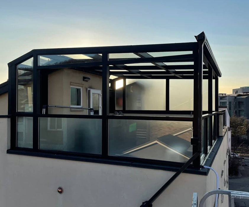 테라스 썬룸과 옥상 썬룸 두 군데를 시공했는데요. 높이가 상당한 작업이었습니다.