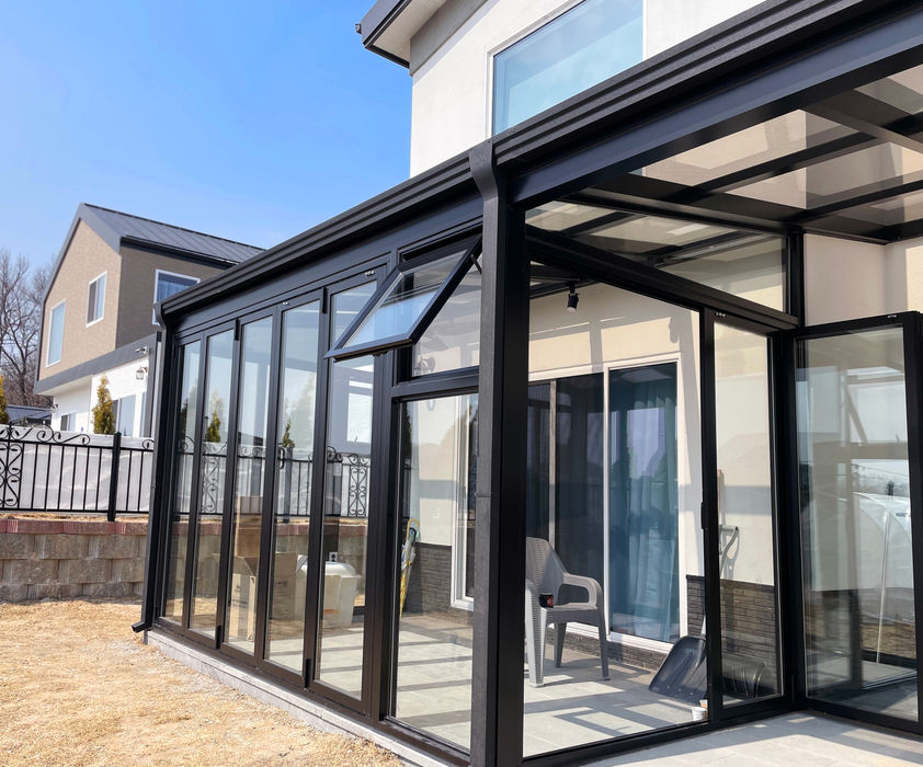 전면 썬룸과 비가림막이 함께 이어지는 디자인으로 포치썬룸 시공해 드렸습니다.